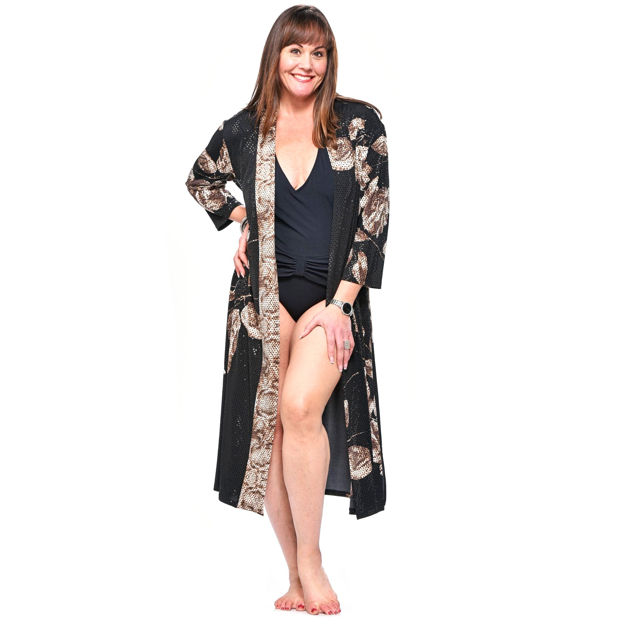 Whether you're heading out for a casual day out or a special occasion, our Print Duster is sure to make a statement. With its unique print and flattering silhouette, it effortlessly elevates any outfit. This duster is also a stunning beach coverup. A must have piece that combines fashion-forward design with unbeatable comfort. Machine washable, perfectly packable, available in plus sizes and made in Canada.