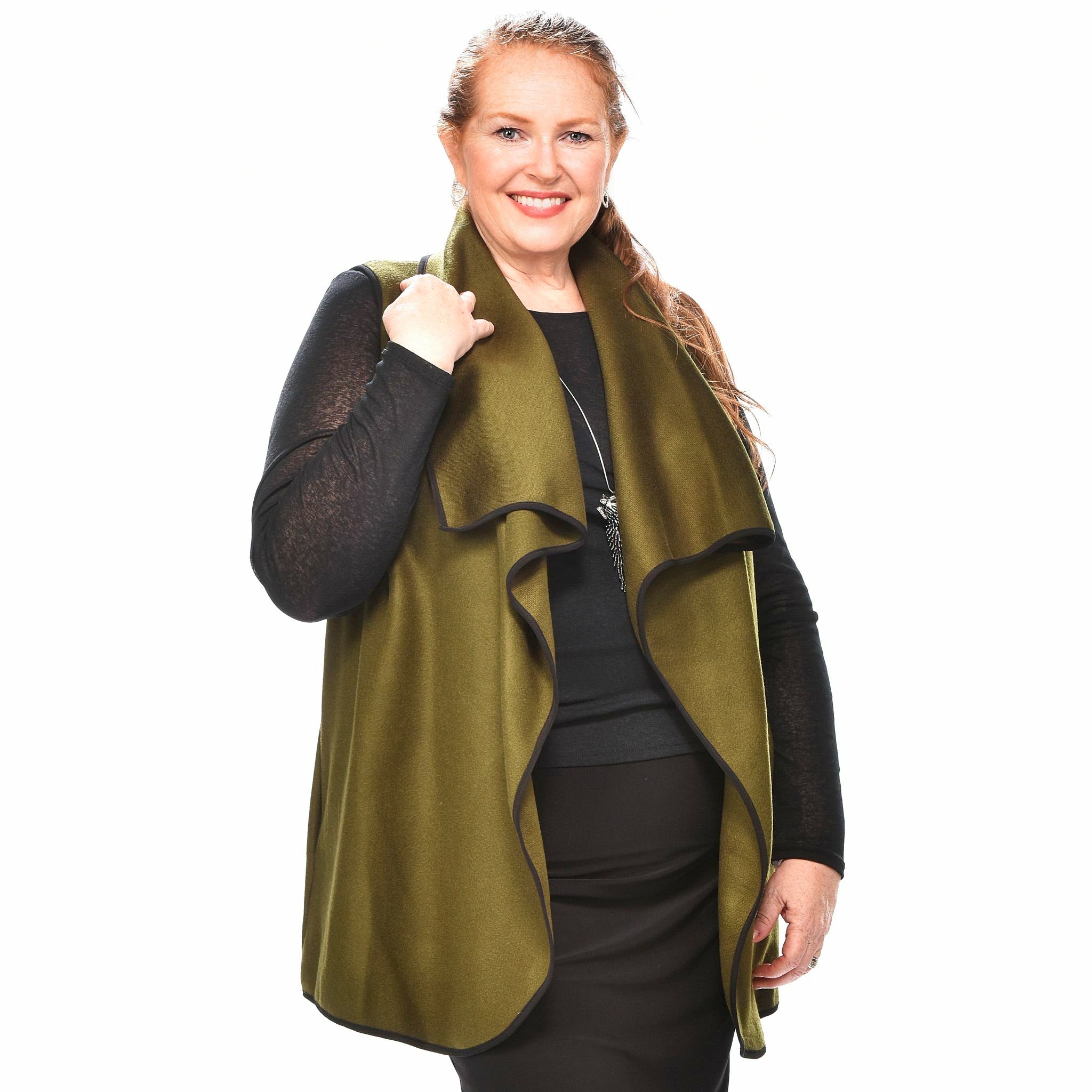 What an incredible look. These gorgeous wool blend vests combine total luxury with chic styling. You'll love this look. Check out the black contrast piping on beautiful solid colours, they also have pockets and a detachable belt. Made in Canada by Rapz Lifestyle Clothing.